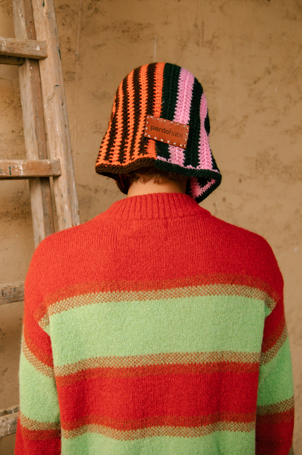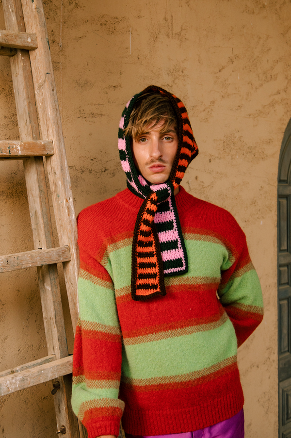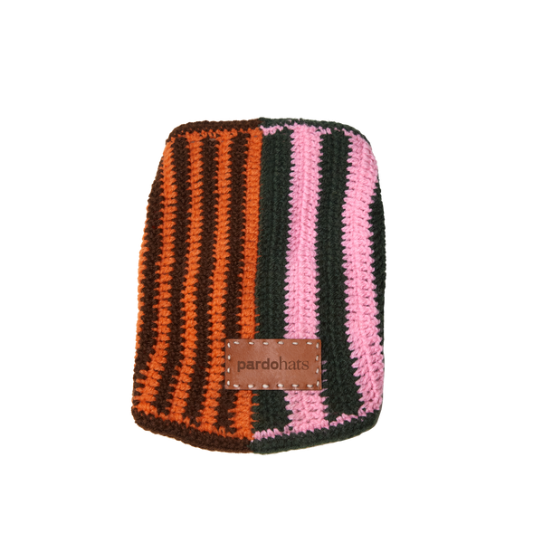 Handmade upon order in Barcelona, the Puri is a beautifully crafted balaclava made from natural wool, featuring an enchanting blend of pink, dark green, orange, and brown hues.