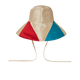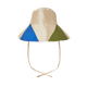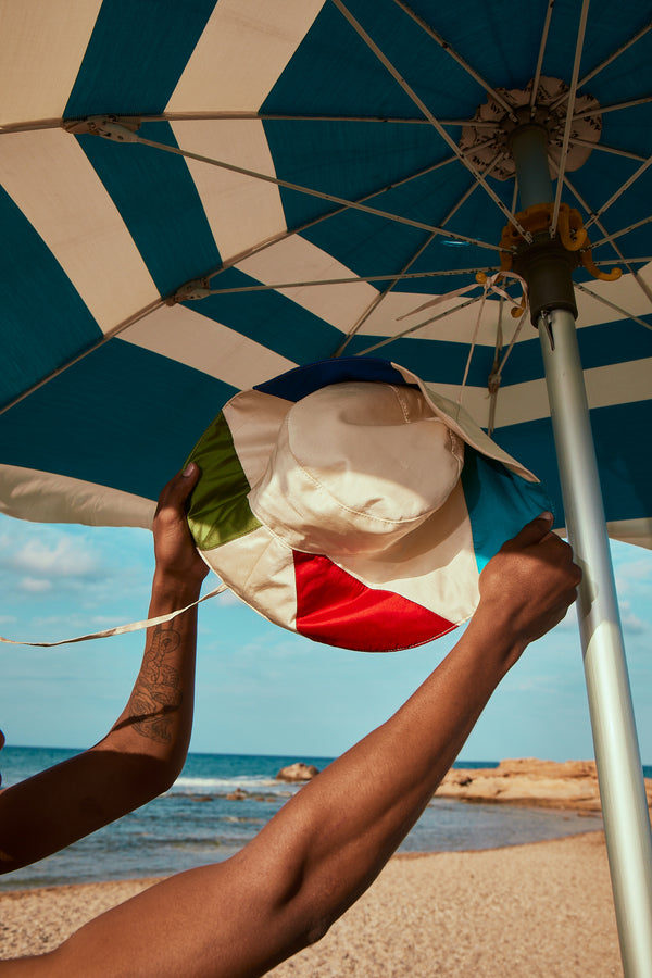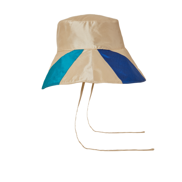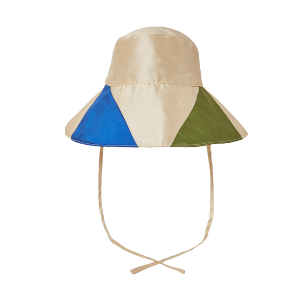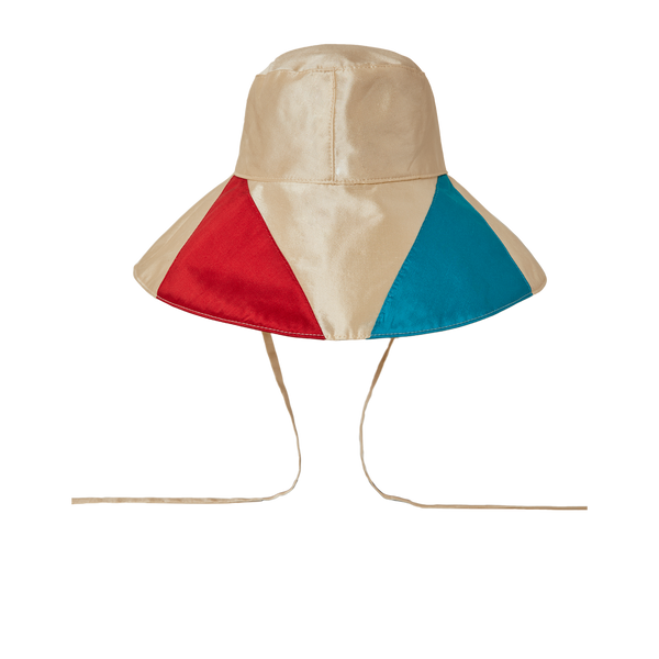 Handmade upon order in Barcelona, the Capurgana is an exquisite fisherman hat featuring a long-brimmed design crafted from luxurious satin. With its elegant beige hue complemented by vibrant panels in red, green, blue, and turquoise, this hat is not only stylish but also practical for sun protection.